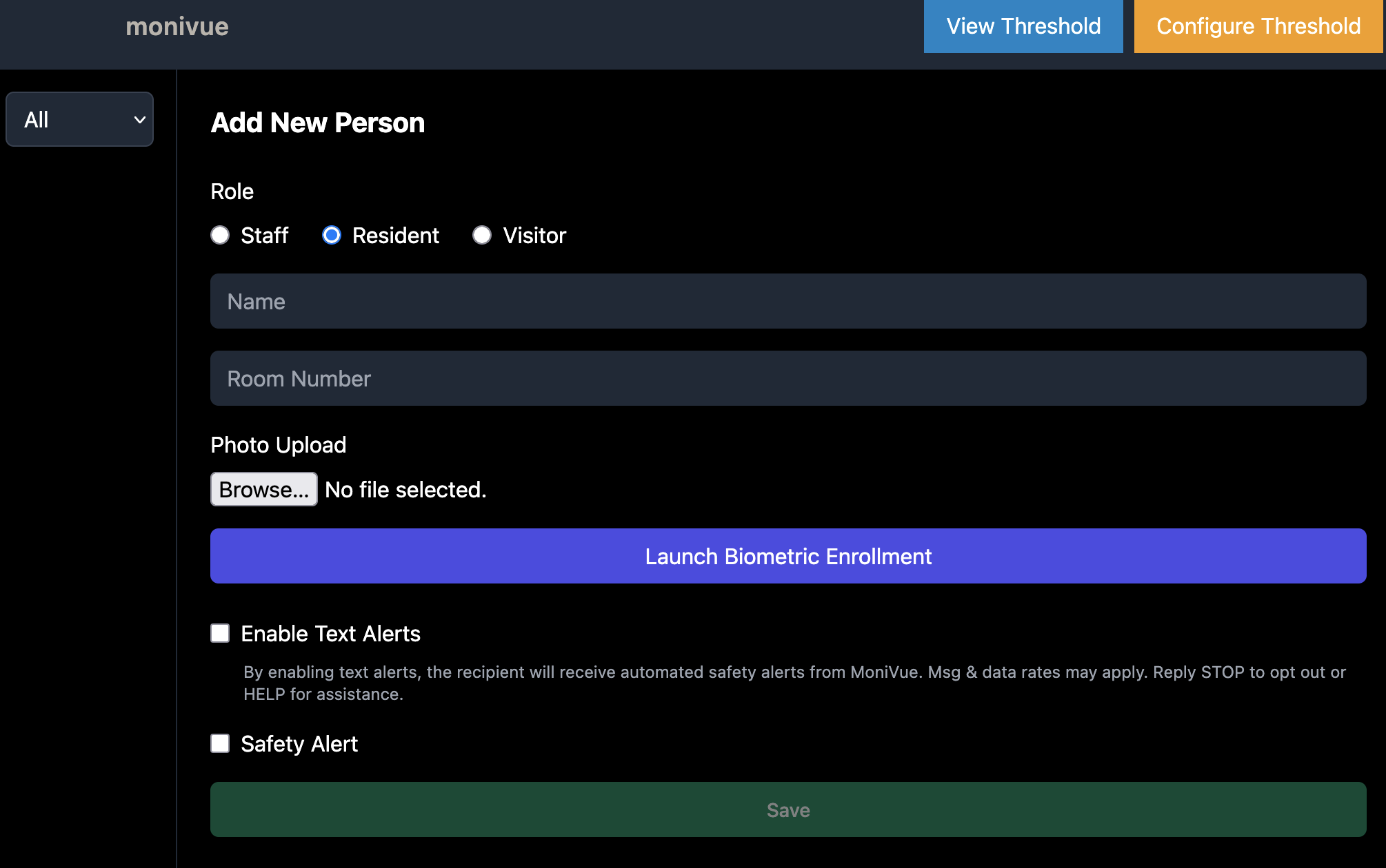 Facility administrators log into the secure Monivue dashboard. When adding a resident or authorized contact, the administrator enters the recipient's phone number and checks the "Enable Text Alerts" checkbox to explicitly enroll them. Enrollment is only possible by authenticated facility staff.